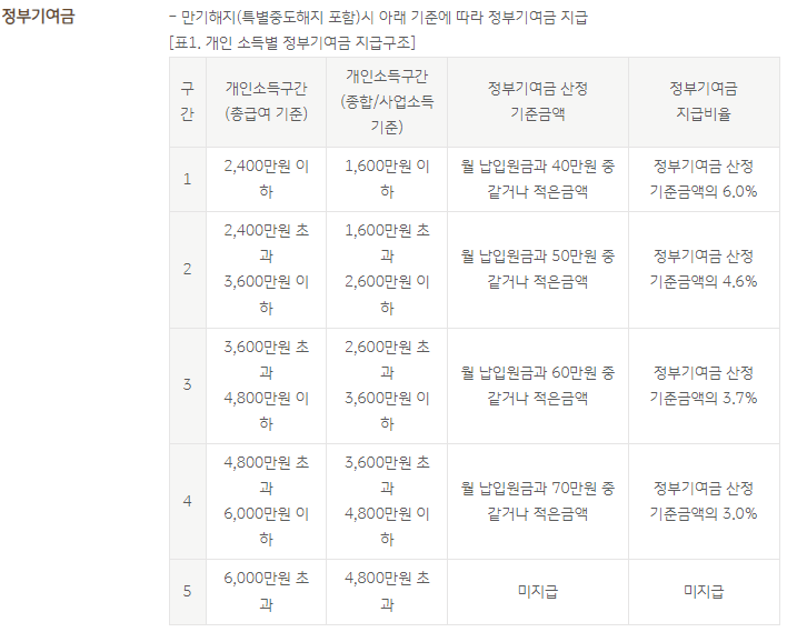 - 정부기여금: 소득 수준에 따라 만기 시 최대 6%까지 정부기여금을 지급받을 수 있습니다.